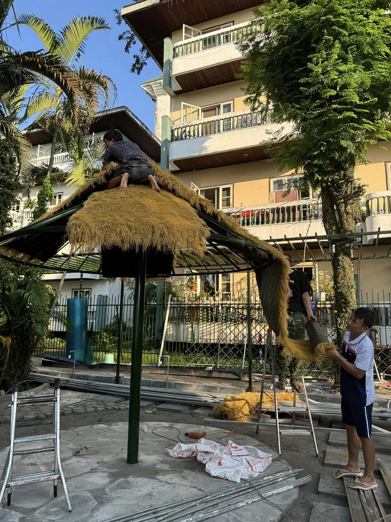 trong quá trình thi công, chính vì vậy phương án lợp trực tiếp Rơm nhân tạo lên